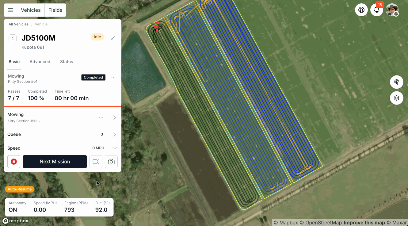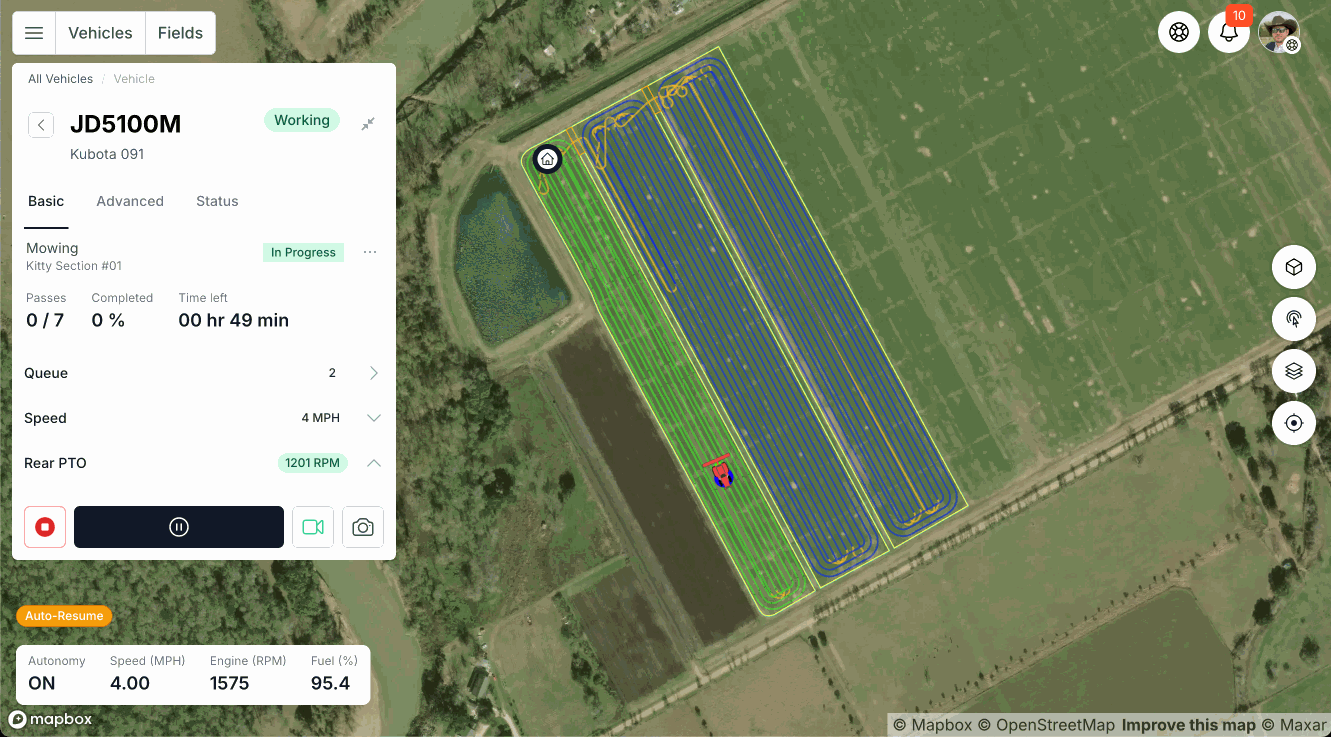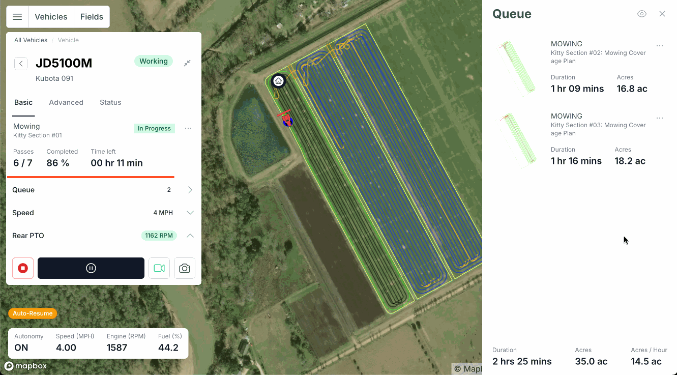 The Mission Queue allows Sabanto autonomy system operators to plan, schedule, and manage multiple missions in advance. Instead of creating and executing missions one at a time, you can queue up a series of missions for your autonomous vehicles, streamlining your workflow and maximizing productivity. This feature is especially valuable for operators managing a full day’s work across multiple fields.