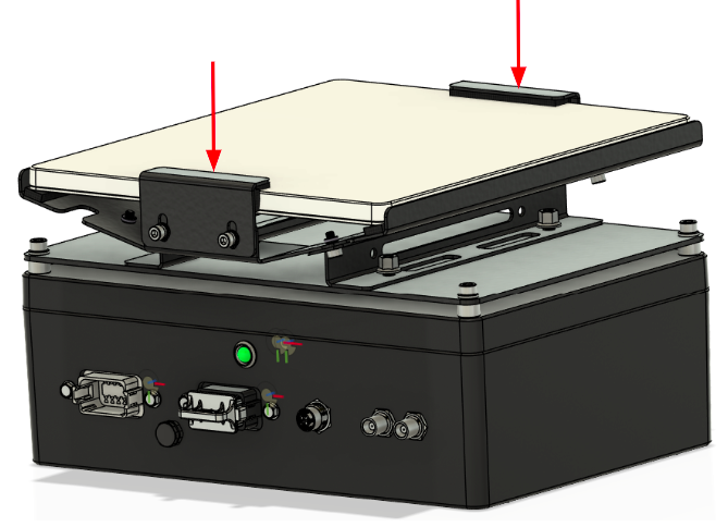 Step 5: Remove the clamping tabs and set the Starlink device in the cradle. Note: The Starlink device might have a plastic stand installed. Remove this stand before setting it into the cradle.