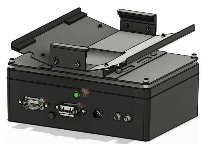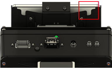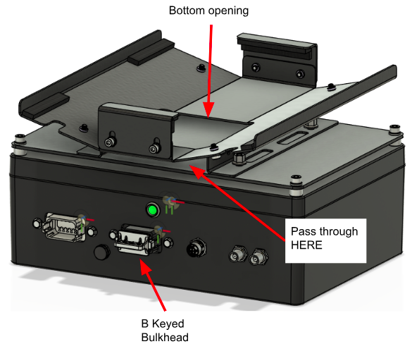 Step 4: Before placing the device in the cradle, we need to run the power cable that will power the device. The cable plugs into the 12 pin B keyed bulkhead (black bulkhead)on the rear of the BFE enclosure. Route the cable under the cradle, it will pass up through the bottom opening in the mounting cradle. There are two slots cut into the bottom of the cradle that you may use for zip ties to secure the cable.