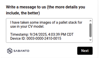 At Sabanto, we are continuously improving our computer vision capabilities. Our current focus is detecting wood pallets—whether filled, empty, or carrying materials. To support this effort, we need real-world images captured directly through vMC on a Sabanto system; phone photos cannot be used. Please take images of each obstacle from multiple angles using vMC. If you encounter other obstacles you’d like the system to recognize, you are welcome to submit photos of those as well for future integration.